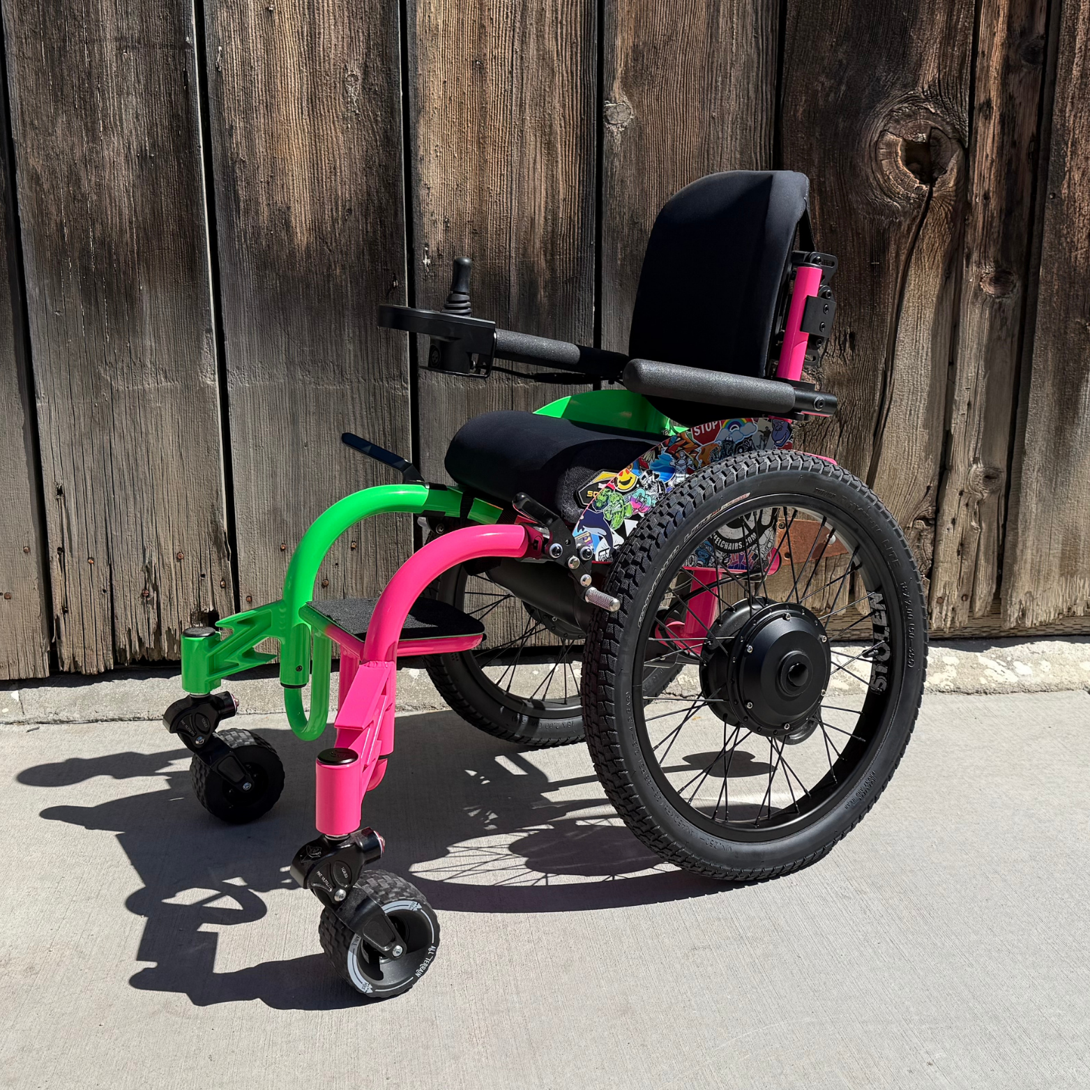 A power wheelchair like never before. Each wheelchair is built uniquely for the driver and utilizes a lightweight power wheel system. The lightweight rigid frame has a folding backrest and allows for easy transport.