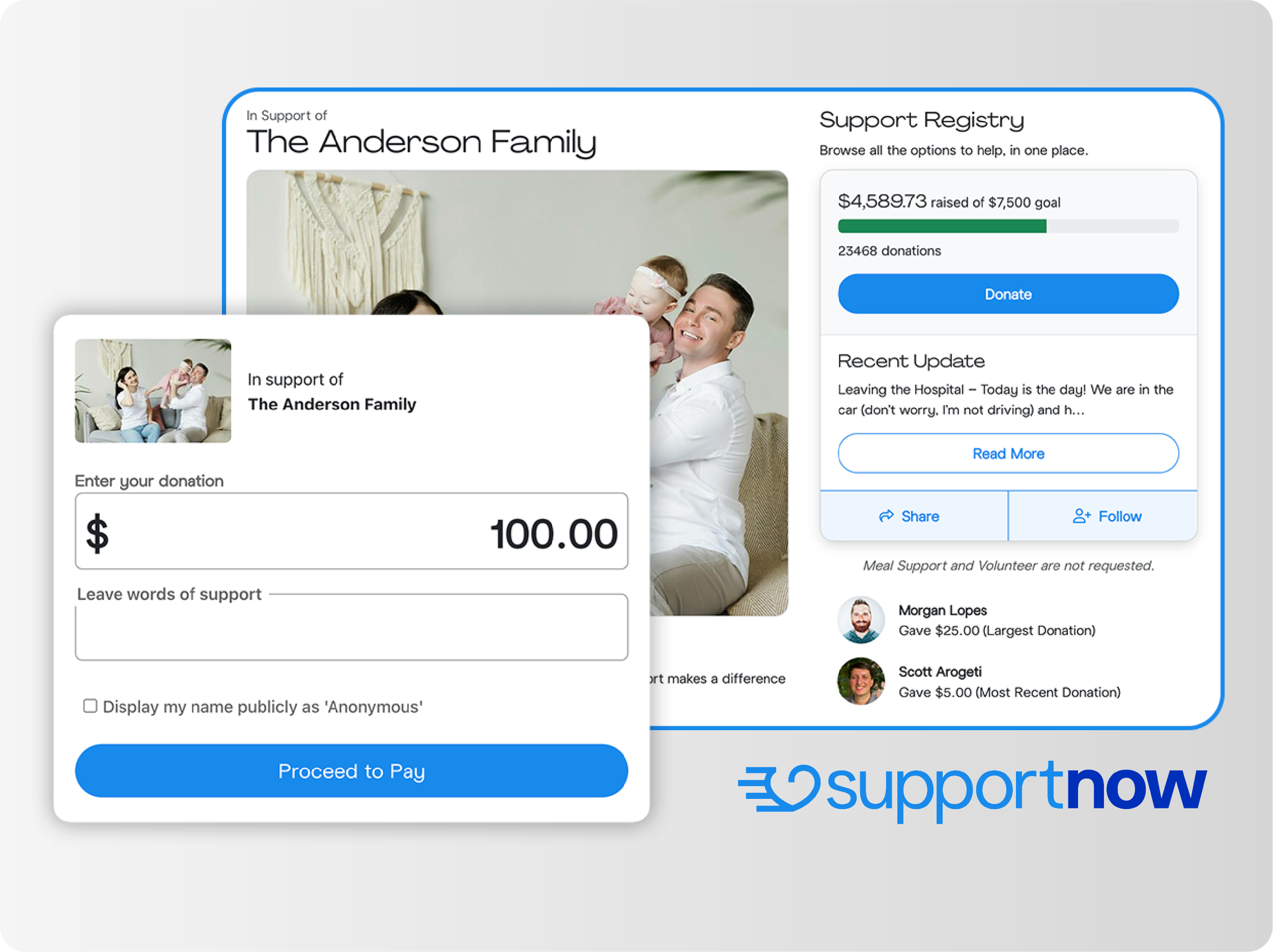 SupportNow is the all-in-one family support platform. It's available at no cost and allows families to keep 100% of funds raised.